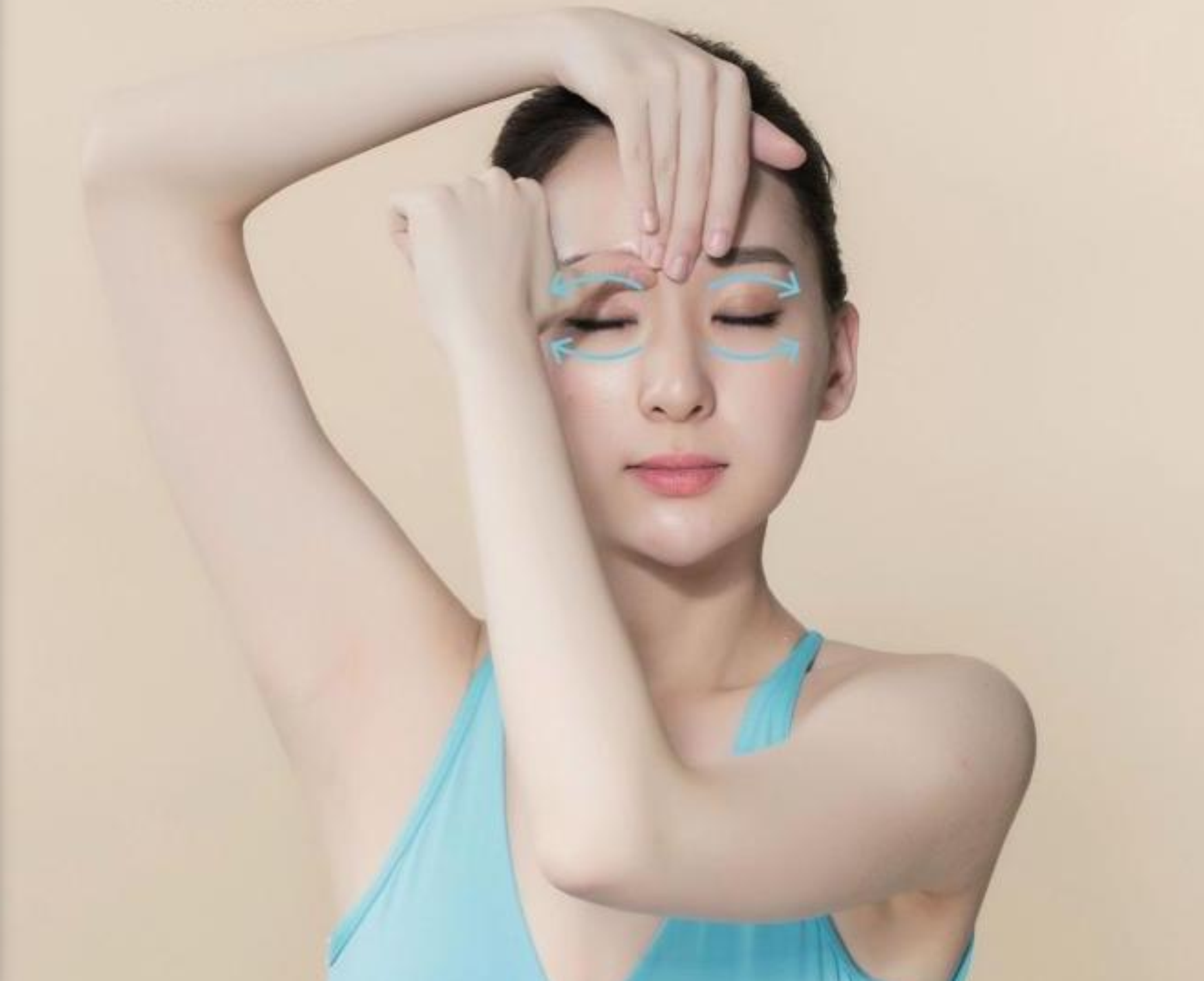 1. 由上眉骨处开始,用手指指腹以弹钢琴的方式由内至外地绕眼周弹动,然后以中指腹轻轻地由内而外顺着眼窝轻滑至下眼头,重复动作3次 。